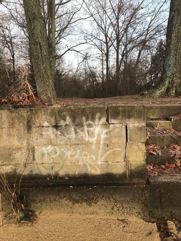 And the water view from the wooded path on our morning walk is lovely, but the cinder block wall by the water is pretty broken down and it has graffiti on it.