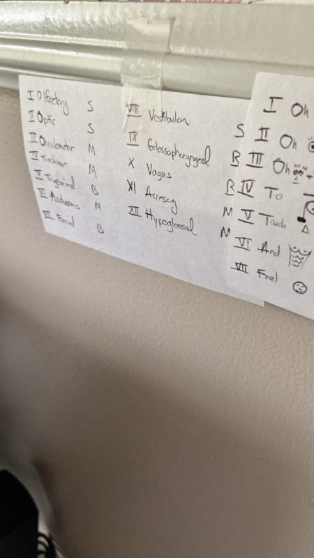 In A&P 1, I’d made some flash cards for the cranial nerves and taped them to my bathroom mirror.