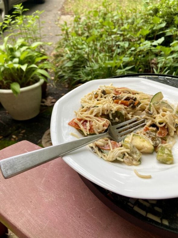 You may remember that I got it from my Buy Nothing group last year and it makes a nice spot to eat dinner outside when the weather is nice. 🙂