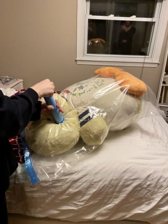 Lisey decided she needed to take him with her to Hawaii (because of course!) so she stuck him into a space bag and vacuum-sealed him and OH MY WORD, this made the three of us laugh so hard.