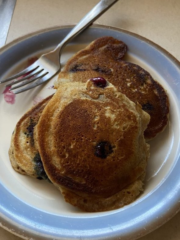 I’ve been using this whole wheat pancake recipe, and I just add blueberries.
