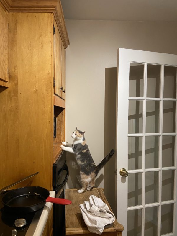 I had brought a nightstand in to help it dry out (the air was so humid out, the wood was feeling kind of wet), so she climbed up on there and really tried to figure out how to jump up there and see what’s behind the microwave.