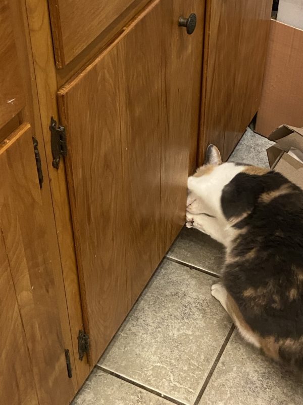 She was busy trying to open the cabinet doors last night while I was cooking dinner.