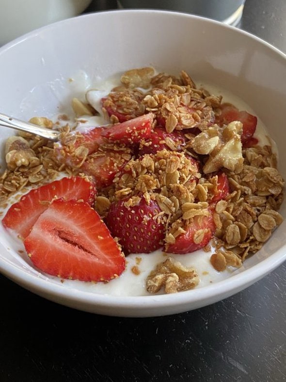 Man, I forgot how much I like this granola! I have been happily eating bowls of homemade yogurt with fruit and granola. SO GOOD.