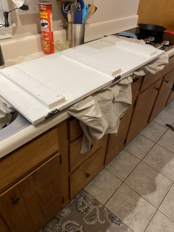 It’s been too humid outside for painting, so I’ve spread a dropcloth inside to work on Sonia’s storage chest.