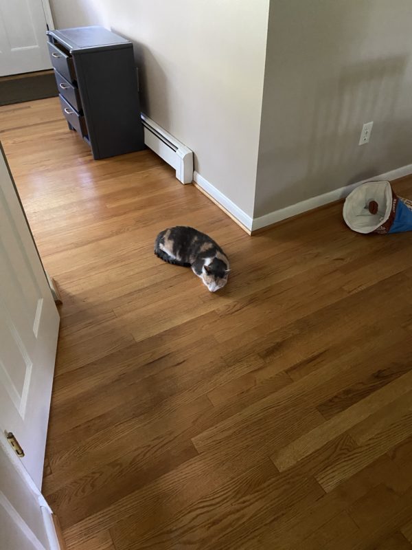 The only complicating factor in here is Chiquita, who is quite invested in depositing fur on my wet paint. So I have to shut the door and then she is distressed.