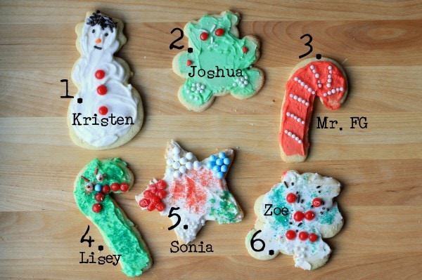 i agree. i thought for sure Mr. FG was the snowman with his whimsical is-he-smiling-or-something-else face and that Kristen was the candy cane with its wonderfully arranged stripes. And then I gave Joshua the agressive candy cane and Lisey the green bear, but looking at it now I should have recognized the level of detail on the green candy cane and known it belonged to Little Baker Lisey!