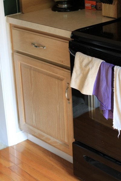 The three under my biggest counter are in pretty decent shape, mostly because they house things I don’t use every single day (unlike the silverware drawer!)