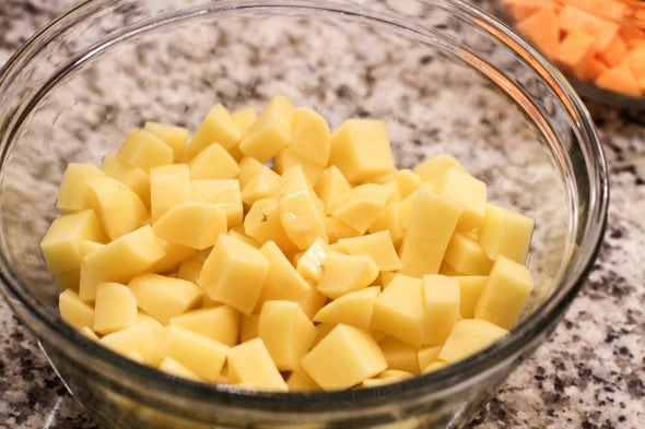 First, peel and cube your potatoes. I use either red potatoes or Yukon Golds. Russets may work too, but they’ll be a little more prone to falling apart when you parcook them.