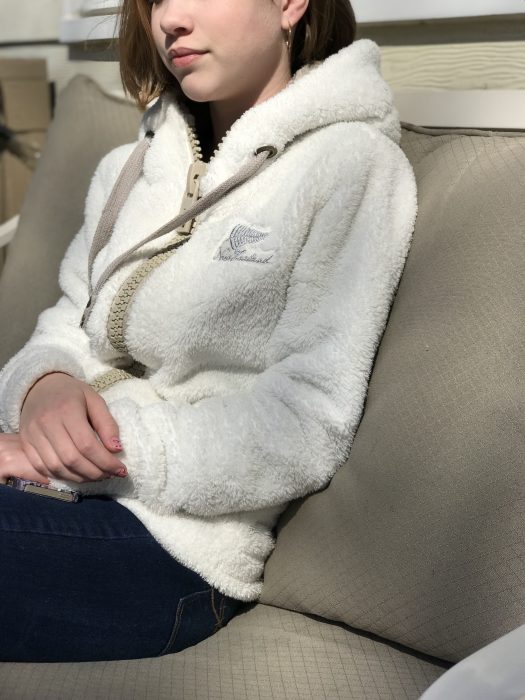 Lastly, this fuzzy jacket with a very, very oversized zipper has been worn by Sonia on an almost daily basis since we got the box.