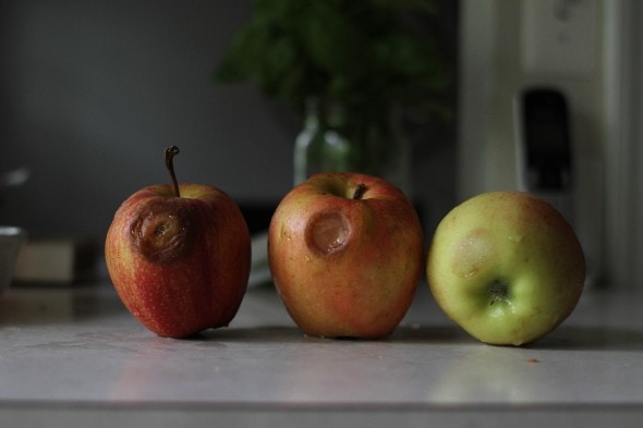 Amy was surprised at this, because as all good tightwads know, it’s very simple to cut out the bitten part and use the rest of the apple. And the same is true if a piece of produce has a bad spot; we tightwads remove the funky part and keep on rolling. 😉