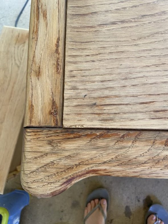 The top is a real wood veneer, but underneath is particle board. So, the previous water damage had caused some bubbling that could not be fixed with sanding.