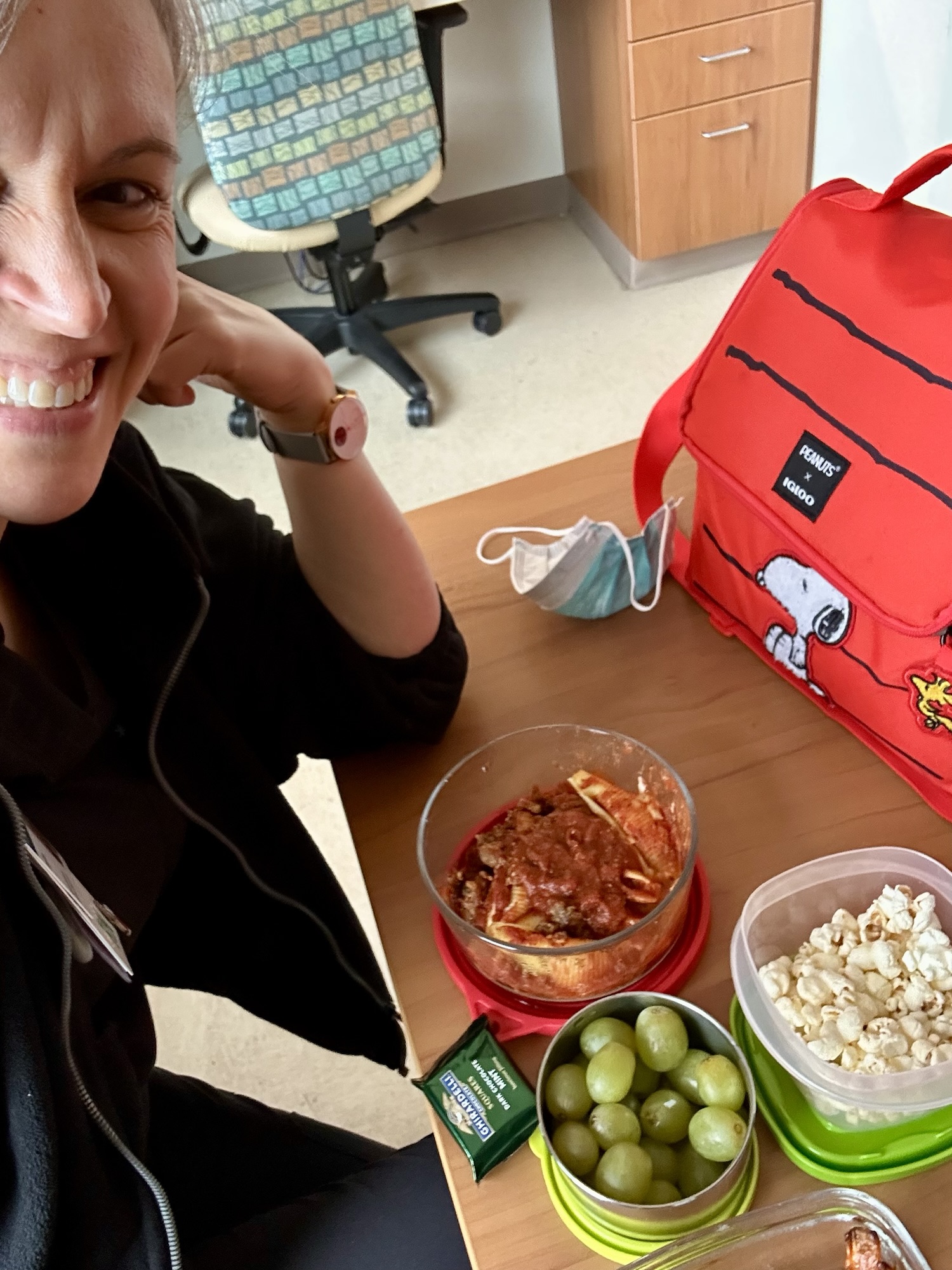 Leftover stuffed shells, grapes and popcorn (I know, I know), roasted carrots, and chocolate.