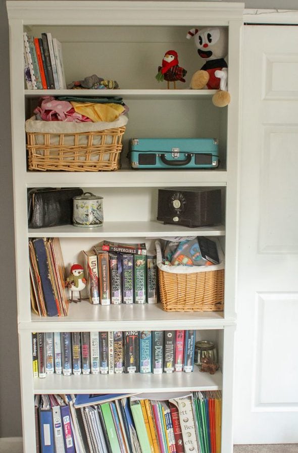 Considering this is a bookshelf, Sonia doesn’t have a lot of actual books in it. But that’s because all of her books are on the other bookshelf that I painted for her!