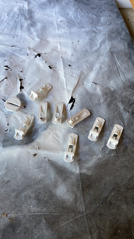 I also had to paint all the little brown shelf brackets. I tried spray paint first, but the color was too cool to match the Cloud White paint.