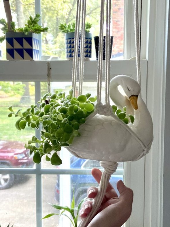 While I was over taking pictures, Sonia wanted me to show this to you guys; it’s a little swan plant pot that I rescued from the abandoned house, and Sonia made a macrame hanger for it so she could hang it in front of one of her windows.