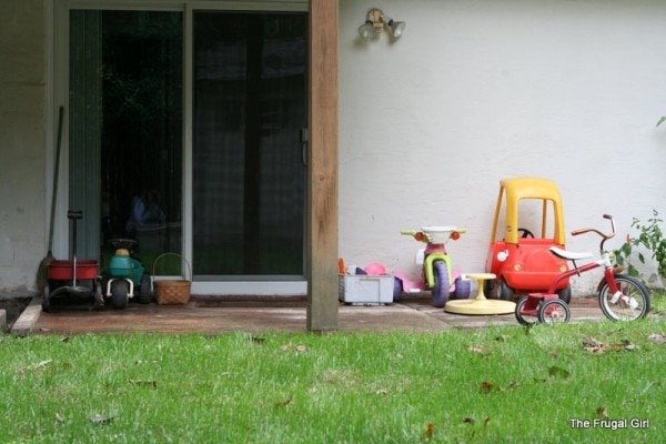 These are my children’s outdoor toys, all of which were hand-me-downs of some sort.