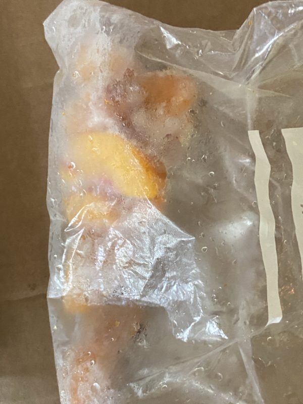 A few frozen peaches from last summer. I think these made it up to my kitchen freezer from my chest freezer when I made a recent smoothie.