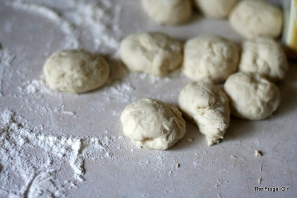 Take a pound of the bread dough, and divide it into small pieces. This isn’t an exact science, but I usually cut my dough into about 15-20 pieces. Roll each piece into a ball.