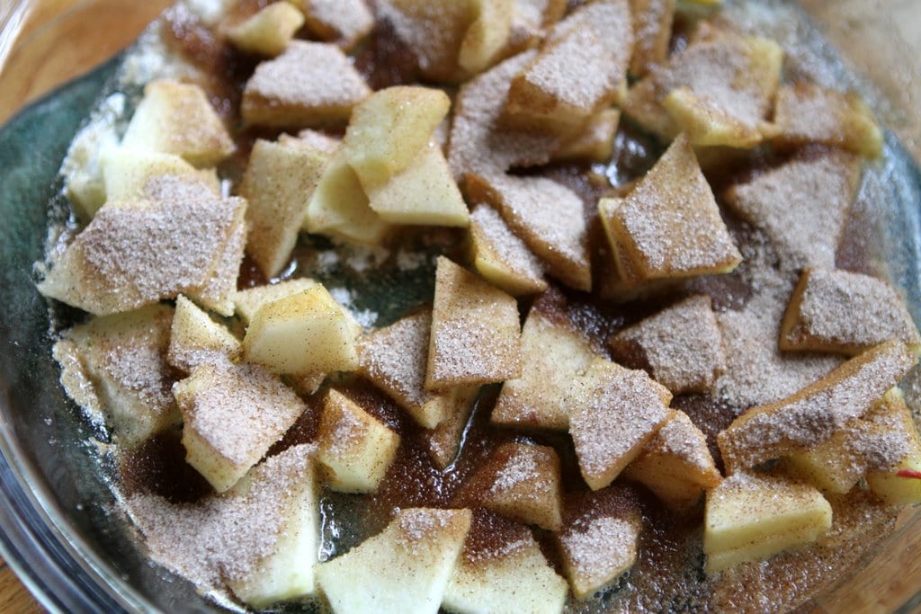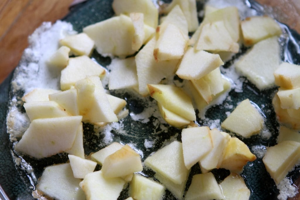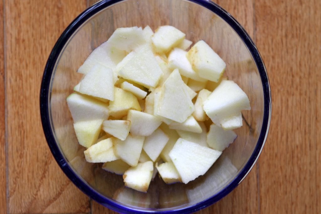 Next, peel and slice up a medium-sized apple. You can use a fresh apple, of course, but this is also a great way to use random leftover apple slices, an apple with a few bites out of it, or an apple with a few bad spots.