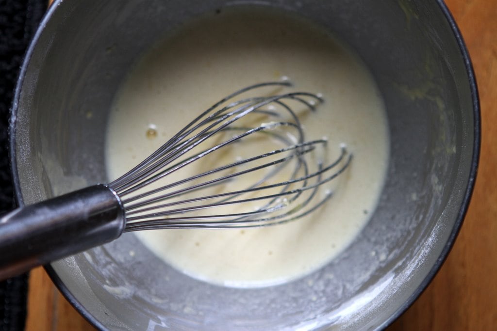 Whisk the flour, egg, and salt together until smooth, and then whisk in the milk. If you add the milk earlier, it’ll be really difficult to get all the lumps out of the flour, so resist the temptation!