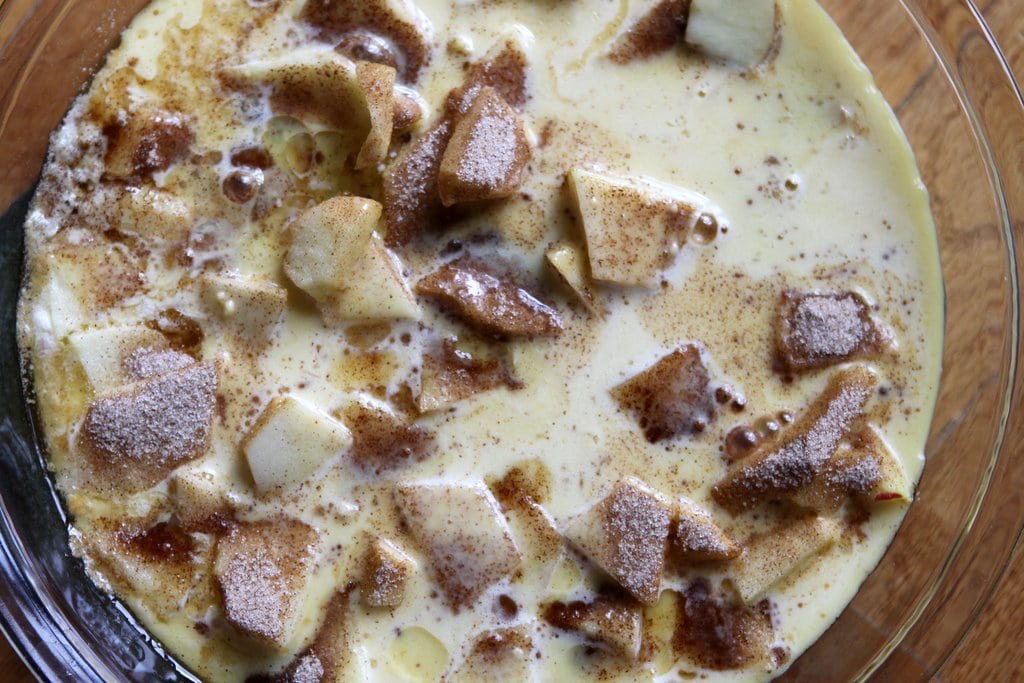 Remove pan from oven when butter is melted. Place apples in pan, sprinkle with cinnamon sugar mixture, and pour egg mixture over top.