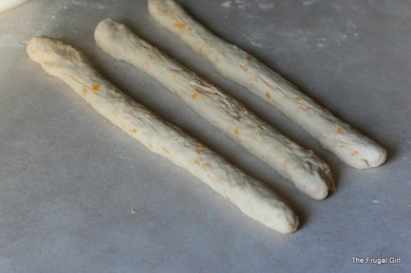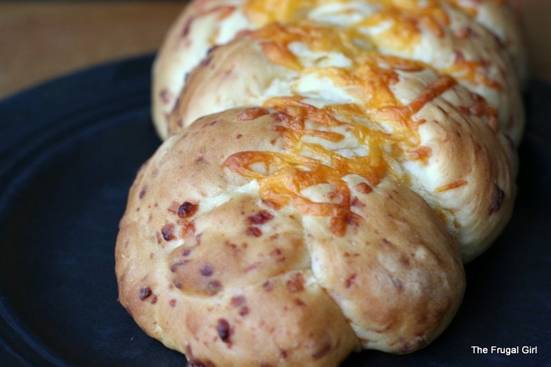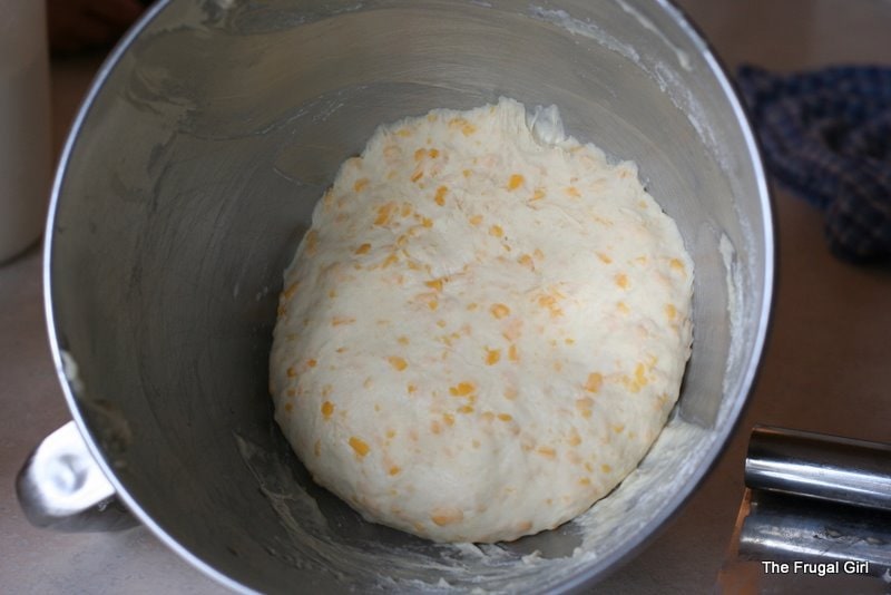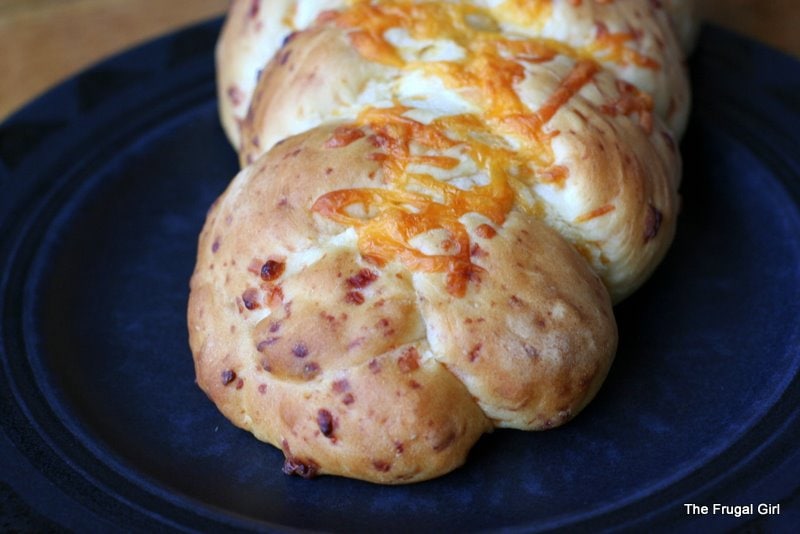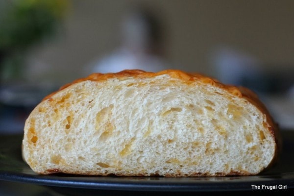 Because 6 ounces of cheese is required for two medium-sized loaves, this is perhaps not the most frugal bread ever, but it is really tasty. Since the cheese is not standing on its own, I do not find it necessary to use really high dollar cheese (not that I really ever buy high dollar cheese), so this bread doesn’t have to be exorbitantly expensive. The $1.50 block of cheddar from Aldi works just fine.