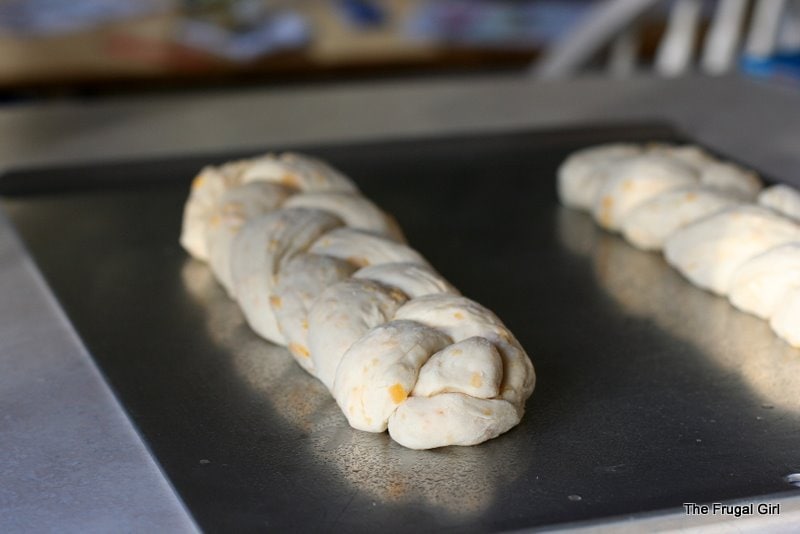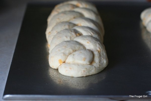 Punch dough down and divide into 6 pieces. Roll each piece into a 12-14 inch rope. Braid three ropes together and place on a greased baking sheet. Repeat with remaining three ropes. Cover braids and let rise until doubled, 30-45 minutes.