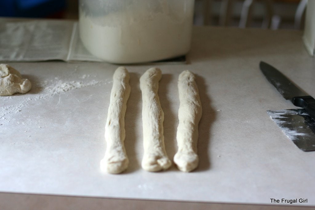 To braid them, you can either start at one end and work to the other, or you can start in the middle, work to one end, and then start in the middle and work to the other end (if you have trouble handling the long strips of dough, this is a good way to go). Repeat with the other three portions of dough and lift the finished braids onto a greased baking sheet.