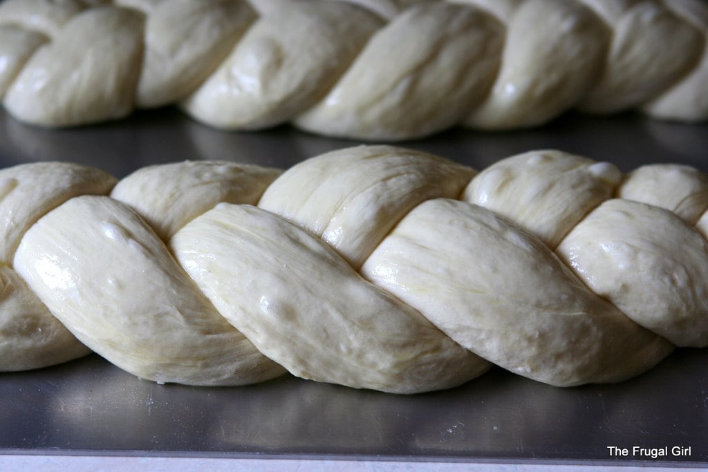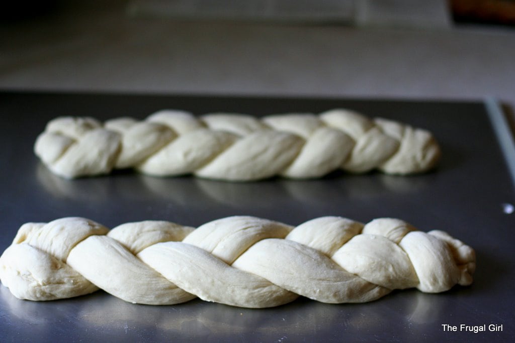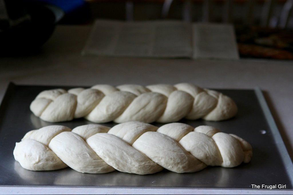 Cover with wet tea towel and let rise in a warm place for 1 hour. Turn dough out onto a floured surface and divide into 6 portions. Roll each portion into a 12-16 inch rope. Braid three ropes together; pinch ends to seal. Repeat with remaining dough, and transfer braids to a greased baking sheet.