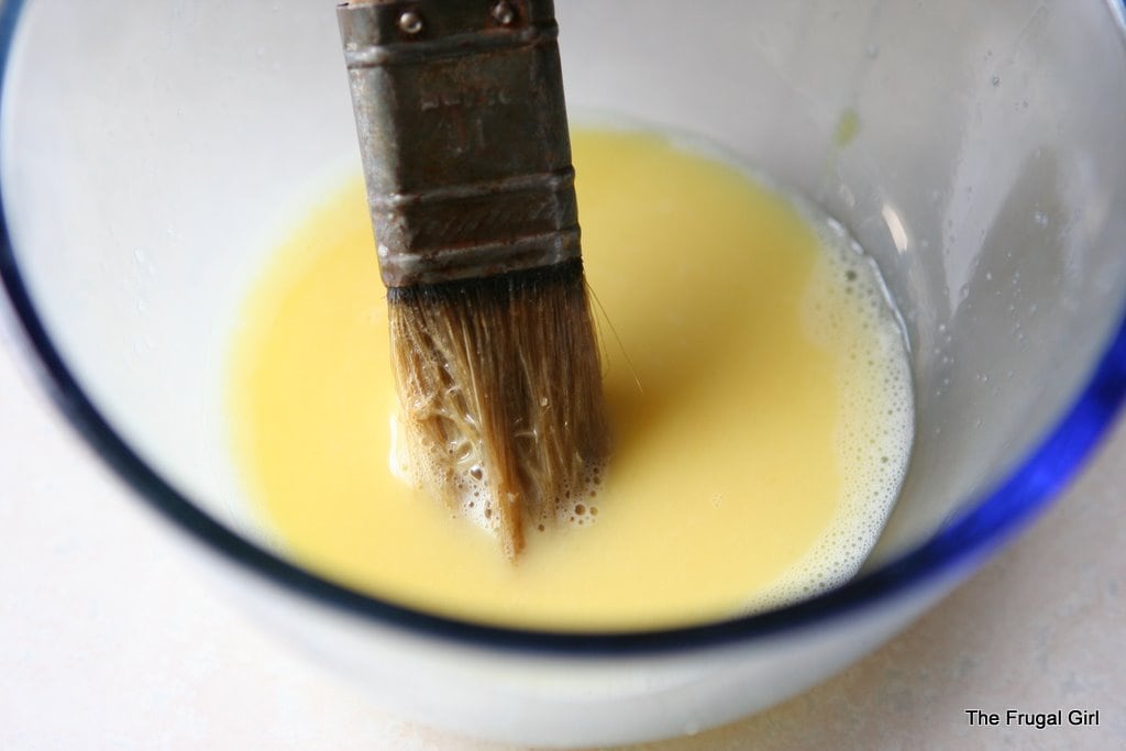 To make an egg wash you just beat an egg with a tablespoon of water, and then use a pastry brush to gently brush it onto the risen loaves.
