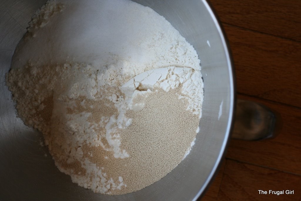In a mixer bowl, combine sugar, yeast, salt, and 2 cups flour.