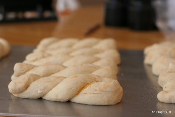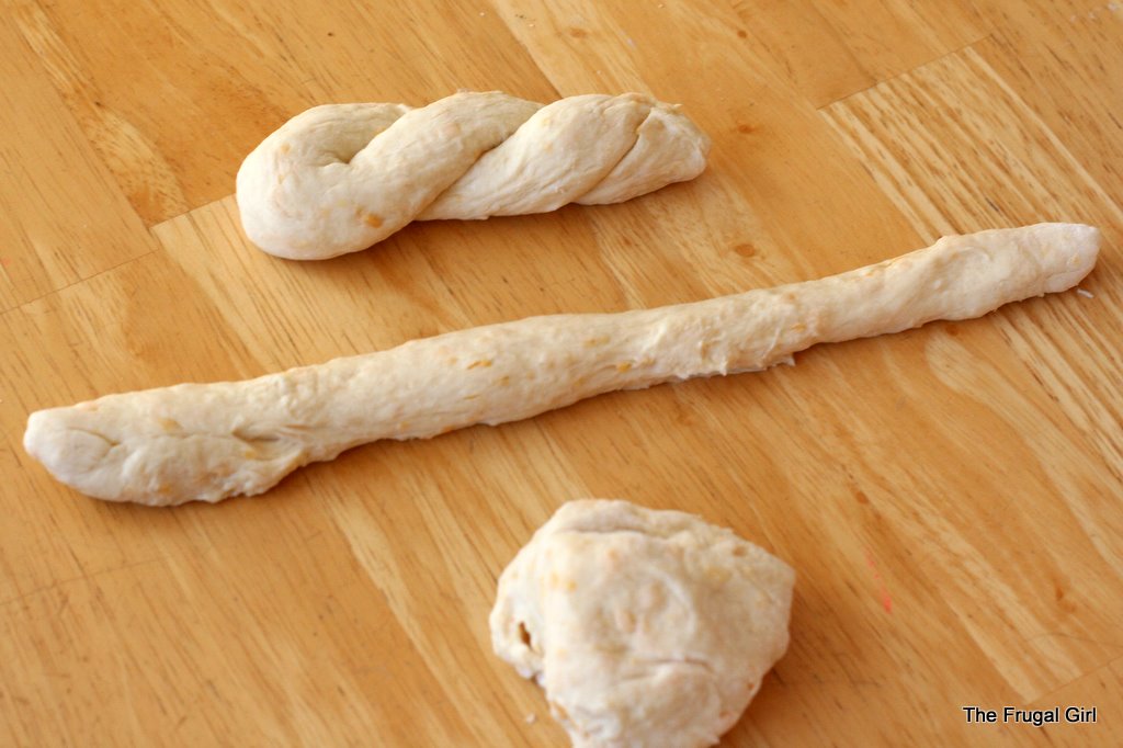 When the dough has risen, punch it down, and divide it into 18 pieces. Roll each piece of dough into an 8-10 inch rope. Fold rope in half, and twist 2-3 times.