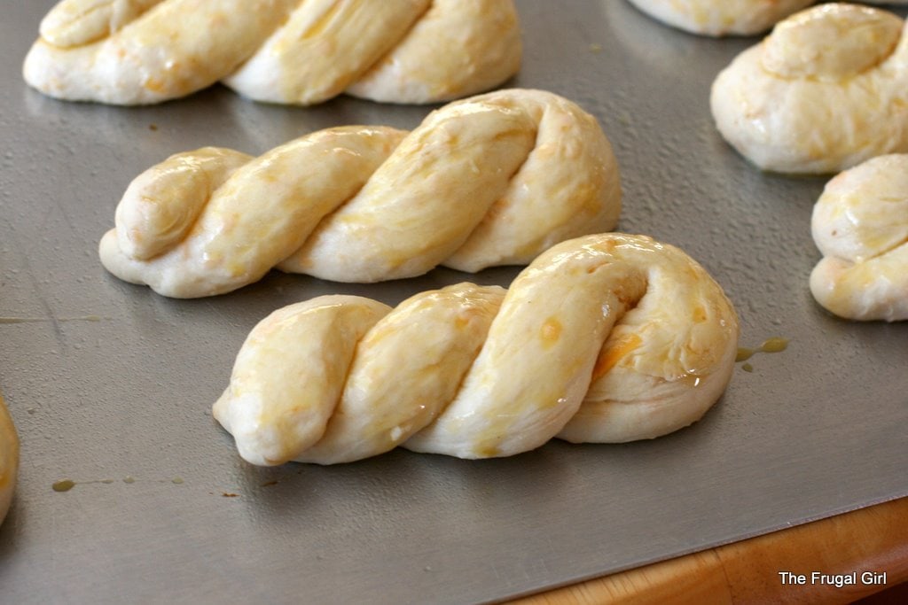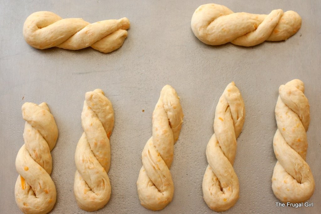 Punch dough down, divide into 18 pieces, and roll each piece into a 8-10 inch rope. Fold each rope in half, and twist 2-3 times. Place twists on a greased baking sheet, cover with a wet tea towel, and let rise 20-30 minutes, or until doubled.