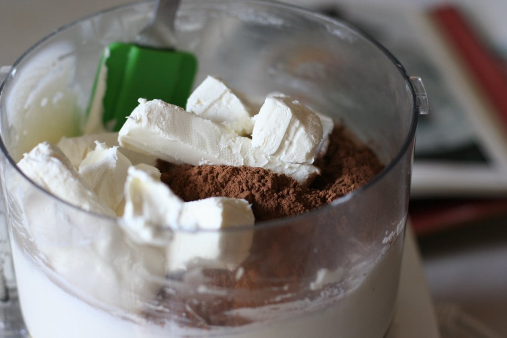 Next, add cream cheese (softened), cocoa powder, and sugar to the food processor bowl.