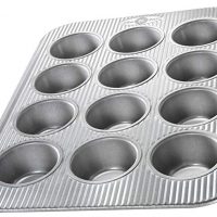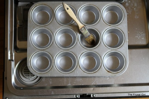 When I grease mine, I set the muffin tin on my dishwasher door (so that overspray goes on the door, not on my counter or floor), spray the cups with nonstick spray, and then I use a pastry brush to make sure the spray is evenly distributed.