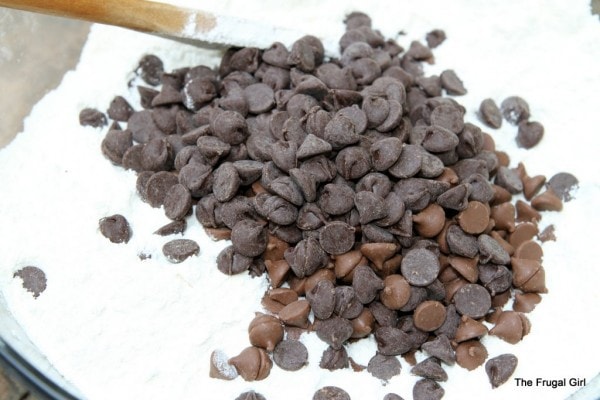 Mix the chocolate chips into the dry ingredients. All Recipes says to fold them in at the end, but I prefer to add them now, as it means less mixing is necessary once the dry and wet ingredients are combined.
