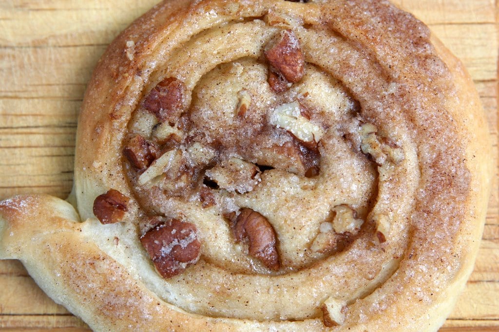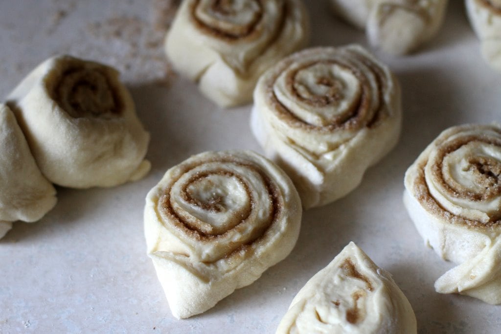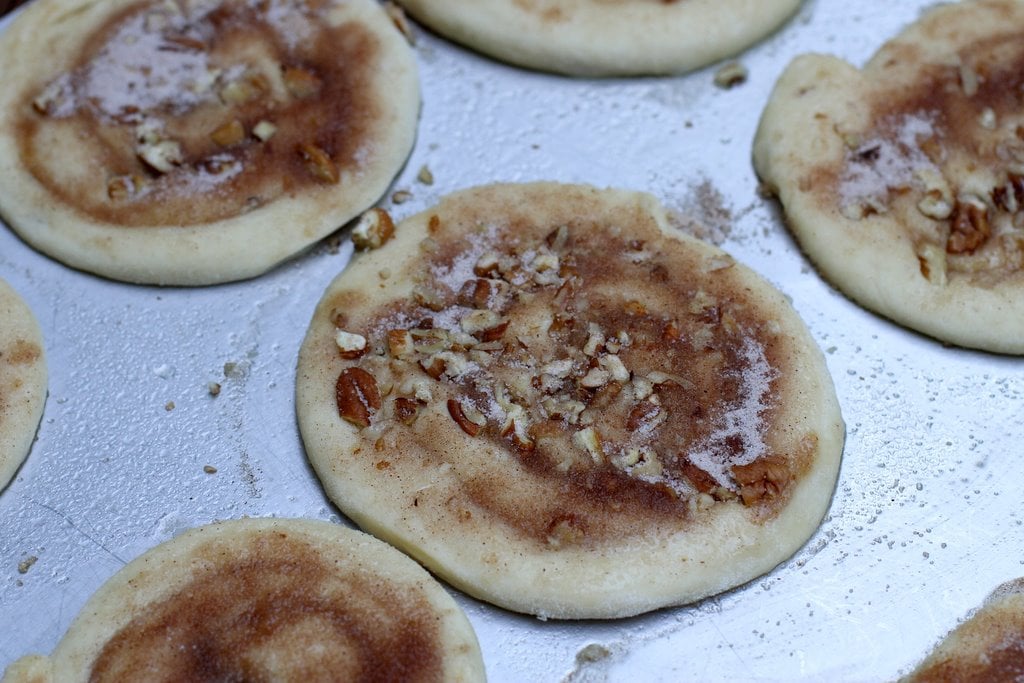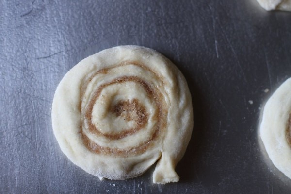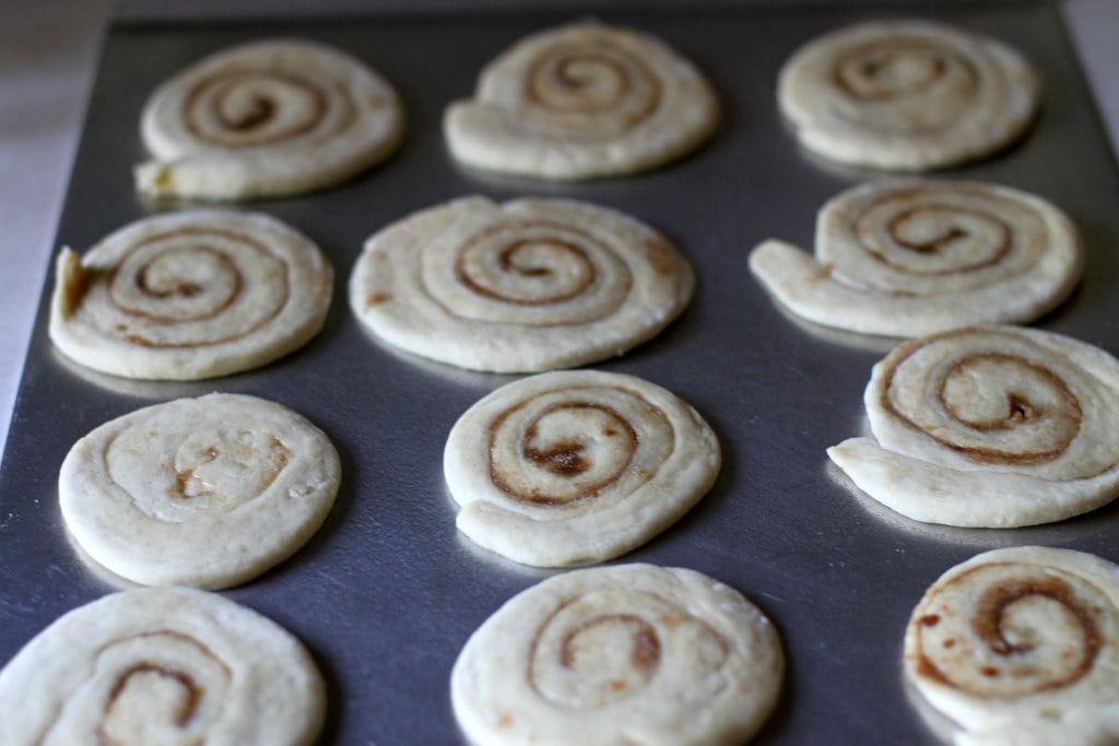 Place the rolls onto greased baking sheets. Since these get a lot wider before you’re done, don’t crowd them. I’d say that 6-9 rolls fit well onto a standard baking sheet (I put too many on mine and butter and sugar leaked out onto my oven floor!).