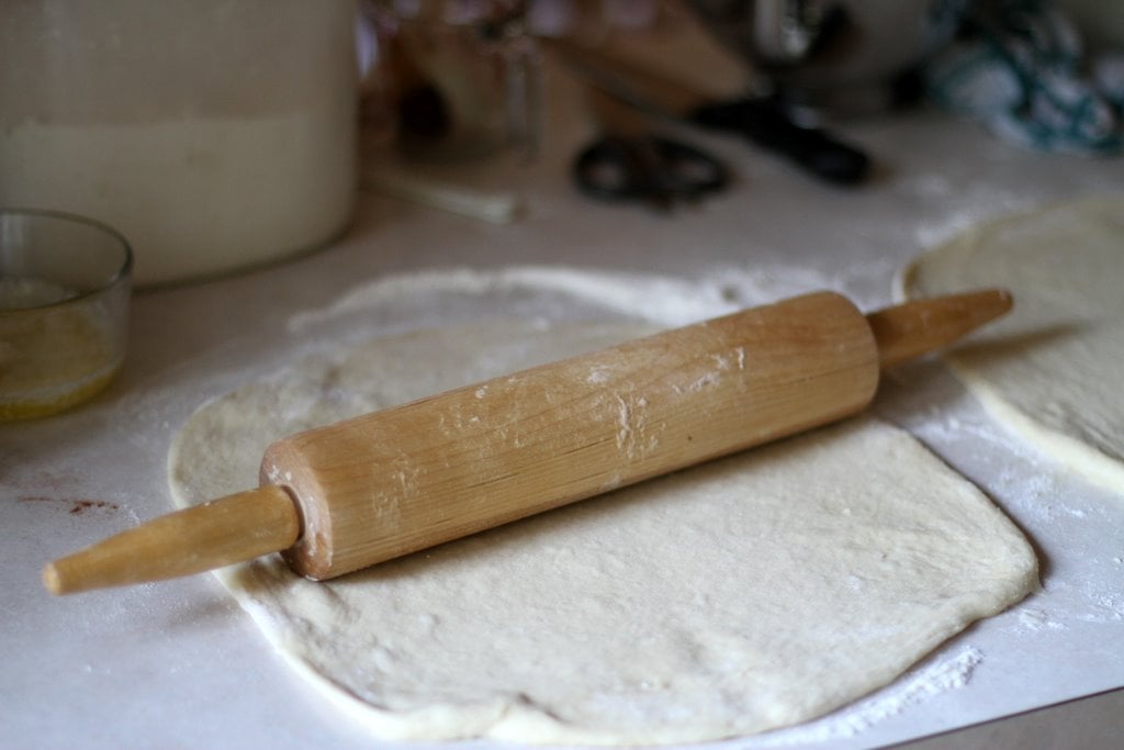 Let the rolls rise for about 30 minutes (I don’t cover mine). Cover them with a piece of waxed paper (I use one piece for both pans), and use a rolling pin to flatten rolls to about 1/8 inch thick.