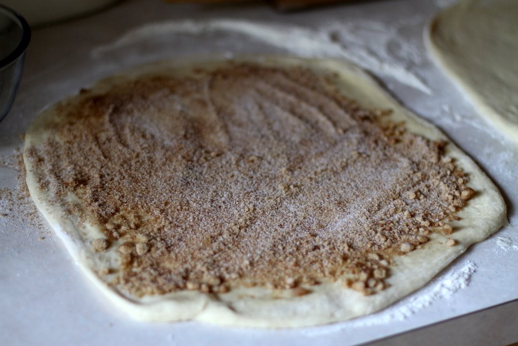 So for one half of the dough, I brushed it with the butter and then sprinkled the dry cinnamon sugar mixture over top.