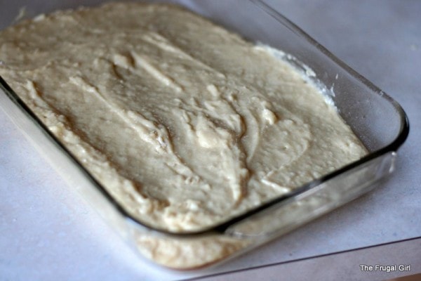 Combine the two, and spread into a greased 8×8 pan (or a 9×13 if you’re making a double recipe, as I was this particular day).