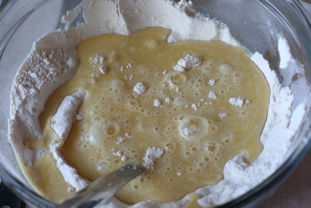 In a separate bowl, combine the wet ingredients. Add the wet ingredients to the dry ingredients. Mix gently until the two are just combined.