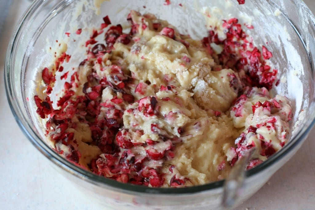 Next, gently fold in your chopped cranberries. I chop mine in the food processor, but you can also do it by hand. How finely you chop the berries is totally up to you…if you like large berry pieces, go for it! If you like your cranberries to be smaller and more evenly dispersed, chop them more finely.