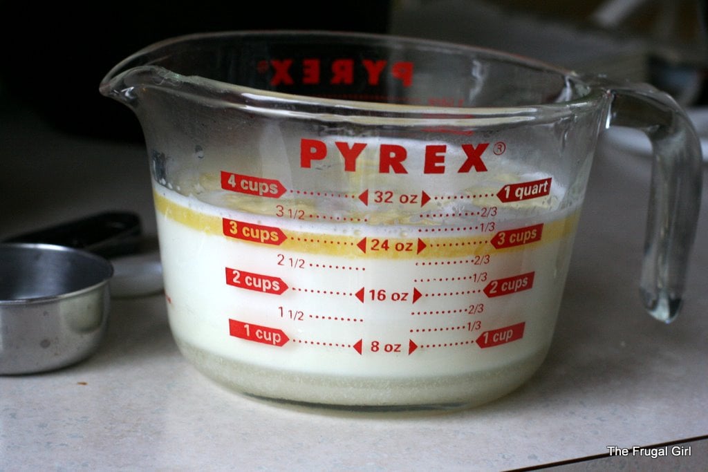 Then heat the milk, butter, sugar, and salt together to about 110 degrees F. My grandma did this in a saucepan on the stove, but a microwave works too. 😉