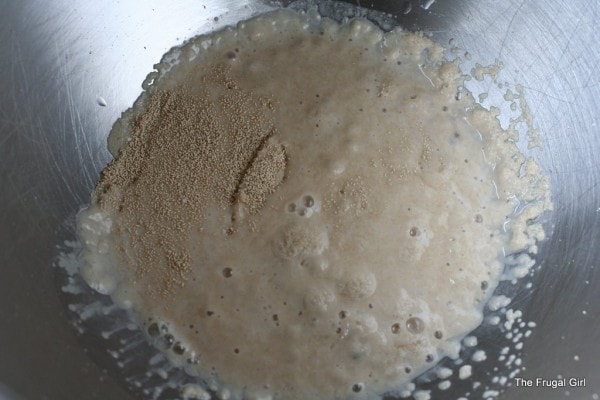 First, dissolve 2 packages of yeast (4 1/2 teaspoons) in 1/3 cup of warm water.