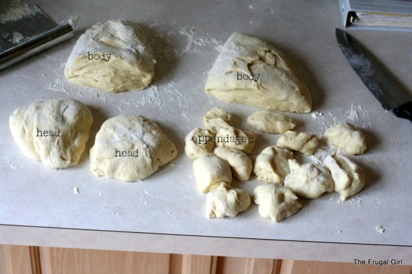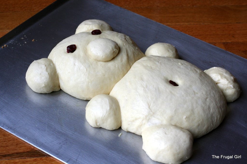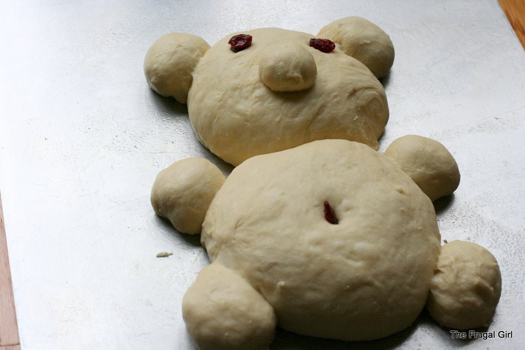Punch dough down and divide into fourths. Shape 2 fourths into balls and place on two greased baking sheets to serve as the body of the bear. Divide 1 fourth in half, shape each piece into a ball, and place above the body piece to serve as the head. Divide remaining fourth into 14 pieces, and shape each piece into a ball. Use 4 balls for the paws, 2 balls for the ears, and 1 ball for the nose of each bear.