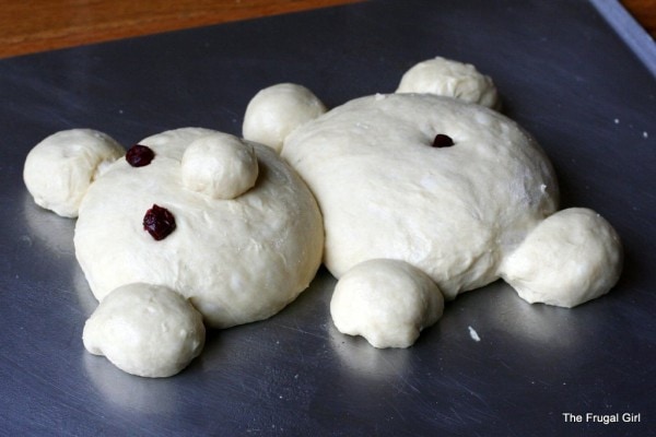 Cover the bears with a wet tea towel and let them rise in a warm place for 30 minutes, or until doubled. Bake in a preheated 350 degree oven for 25-30 minutes, or until browned. Cool on a wire rack.