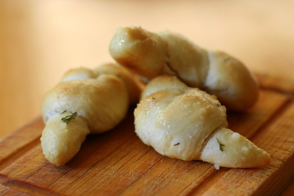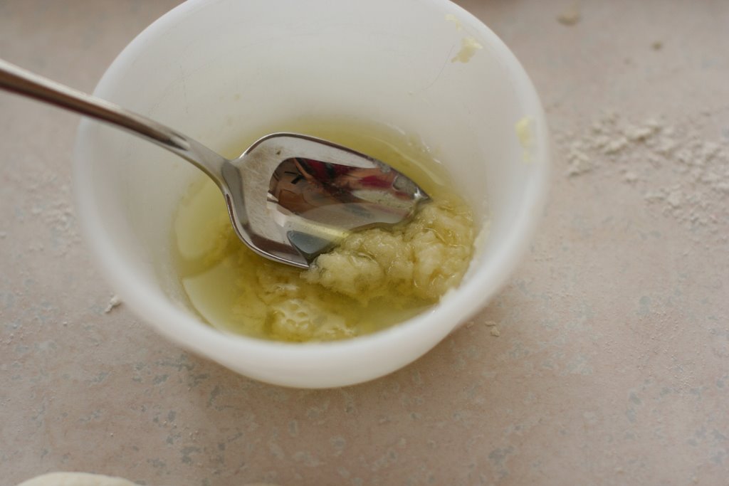 Bake the knots in the preheated oven for 15-18 minutes, or until they’re lightly browned. While the knots are baking, mince some fresh garlic and mash it together with salt to make a paste. Stir in olive oil (or butter or another fat that you like).