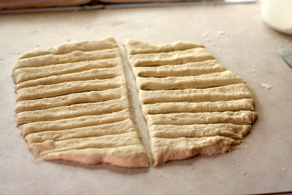 Using a pizza cutter, cut the dough in half down the middle and then cut each half into strips.