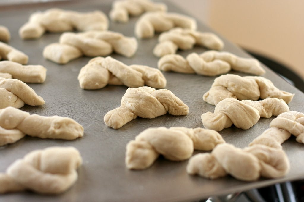 (or cut dough into 40 pieces, roll each into a pencil-like shape and tie each into a knot)
